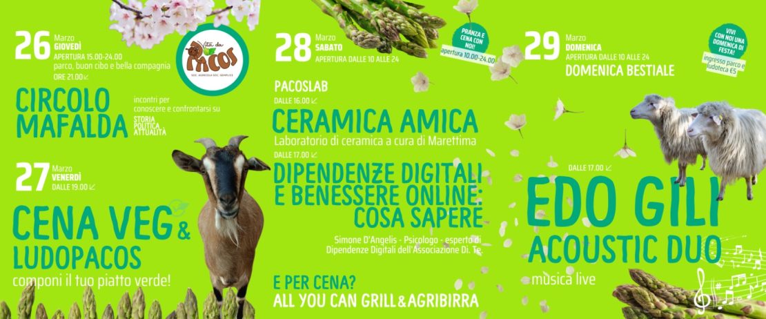 🌼 UNA SETTIMANA A VITA DA PACOS Questa settimana il parco si riempie di primavera, incontri e attività da vivere insieme. Quattro giorni tra natura, animali, buon cibo, laboratori e musica dal vivo per stare insieme con calma e leggerezza. 🌿 Giovedì 19 marzo – Circolo Mafalda Parco aperto dalle 15:00 alle 24:00. Alle 21:00 […]